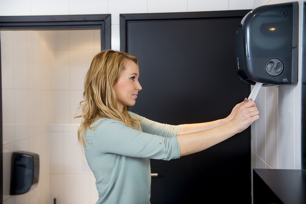 Handdoekrol automaat, zeer geschikt voor drukbezochte sanitaire ruimten. Door vel-voor-vel dosering verbruiks- en kostenbesparend systeem. Zeer hygiënisch doordat gebruiker alleen maar contact heeft met de handdoek welke gebruiksklaar uit de automaat hangt. Geen kans op kruisbesmetting.