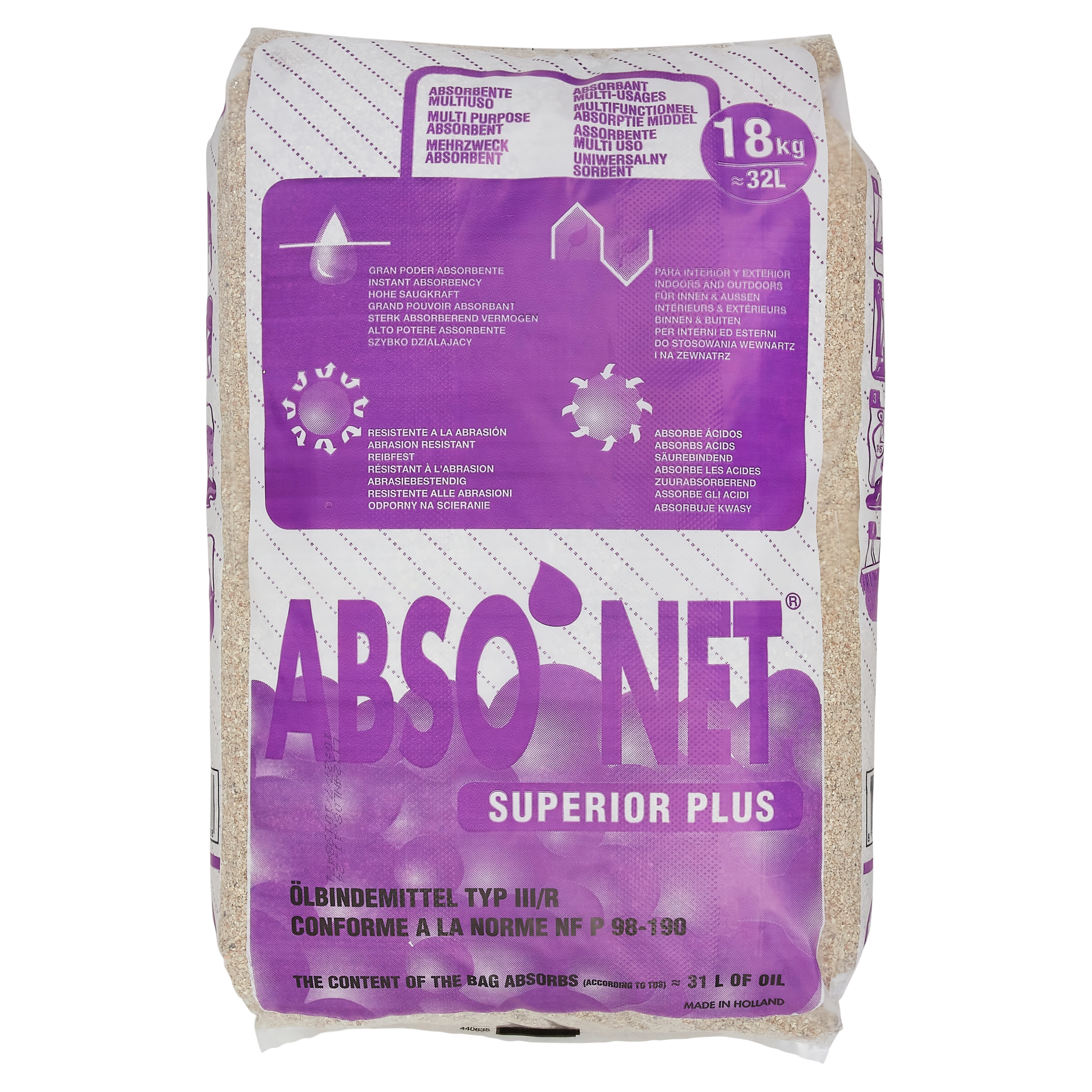 De absorptiekorrels Euro Multi Sorb Superior Plus zijn harde, ongecalcineerde, fijne korrels met een snelle absorptie. De korrels zijn zowel binnen als buiten te gebruiken in omgevingen waar oliën, vetten, smeermiddelen, lichte chemicaliën of andere vloeistoffen gelekt hebben. Deze absorptiekorrel is vooral geschikt bij calamiteiten waar men de korrel voor langere tijd laat liggen. De inhoud van één zak heeft een absorptiecapaciteit van ca. 30 liter.